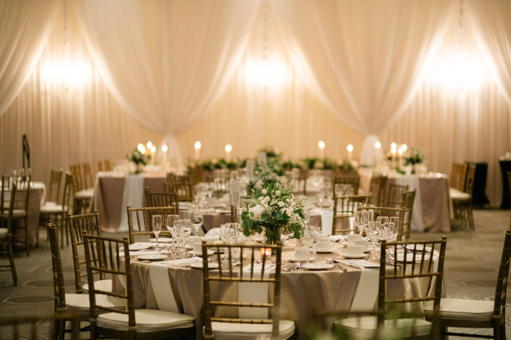 The biggest mistake couples make here is underestimating how much draping elevates the room. Draping softens the scale, improves acoustics, and instantly makes the ballroom feel more refined and high‑end. Pair that with lots of candles and intentional lighting, and the space transforms completely.